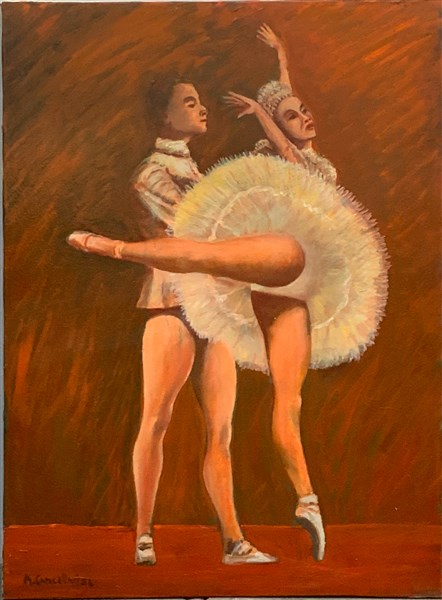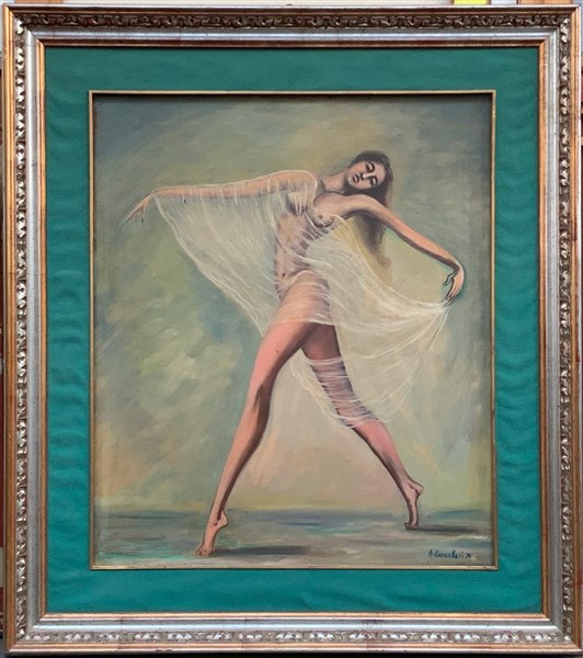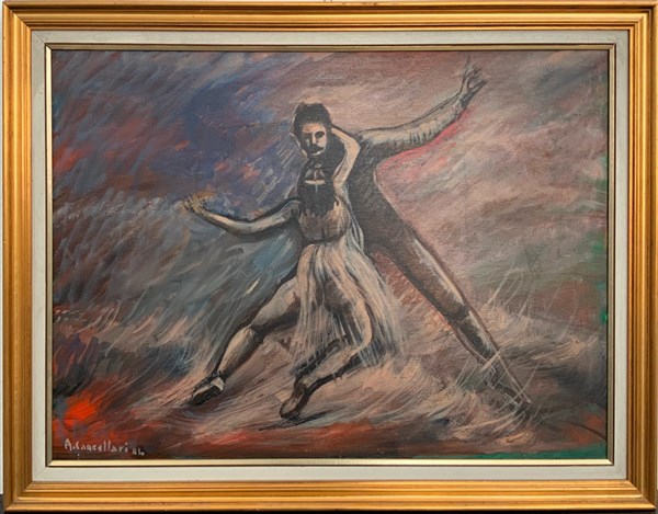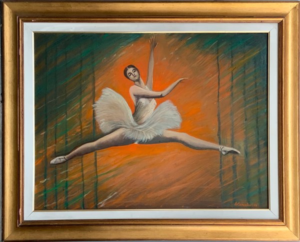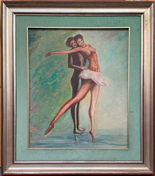 Lotto di cinque dipinti ad olio su tela raffiguranti ballerine e ballerini (cm max 60x80 circa), quattro dei quali in cornice