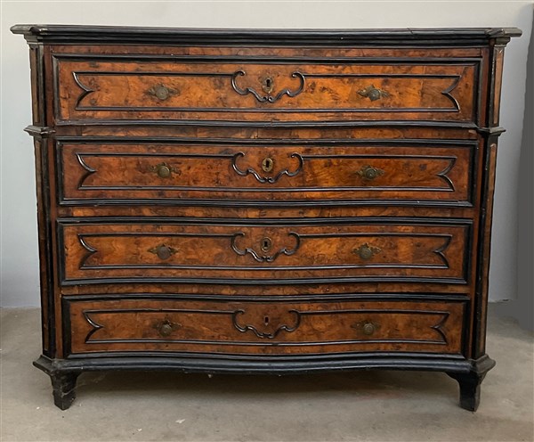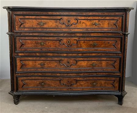 Cassettone in noce con quattro cassetti su fronte mossa, decorato da cornici ebanizzate e lesene angolari. Lombardia, secolo XVIII (cm 142x116x62) (difetti e mancanze)