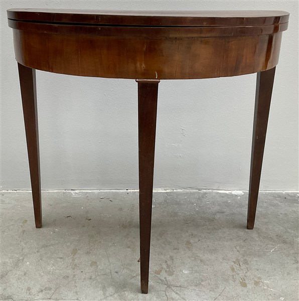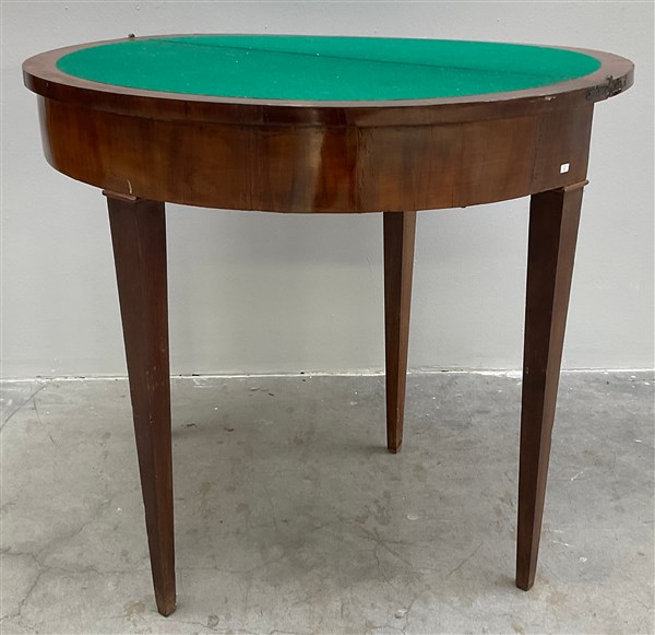 Tavolino da gioco lastronato con piano a libro e gambe rastremate, cassetto nella fascia. Secolo XIX (chiuso cm 89x79x44) (difetti)