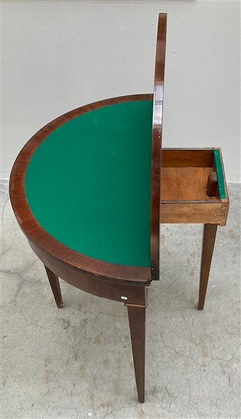 Tavolino da gioco lastronato con piano a libro e gambe rastremate, cassetto nel