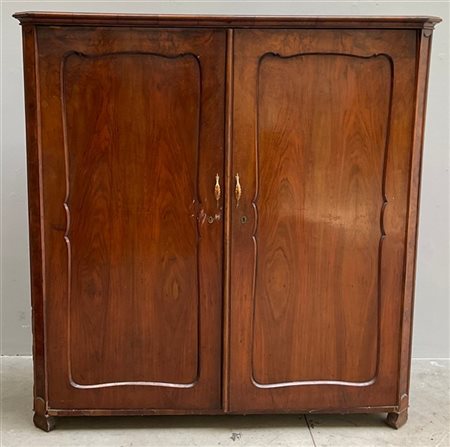 Armadio lastronato in noce e radica di noce a due sportelli pannellati con profili mossi (cm 149x153x52) (difetti)