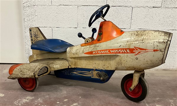 Lotto di due tricicli vintage in metallo smaltato a forma di trattore e di aeroplano (difetti e mancanze)