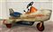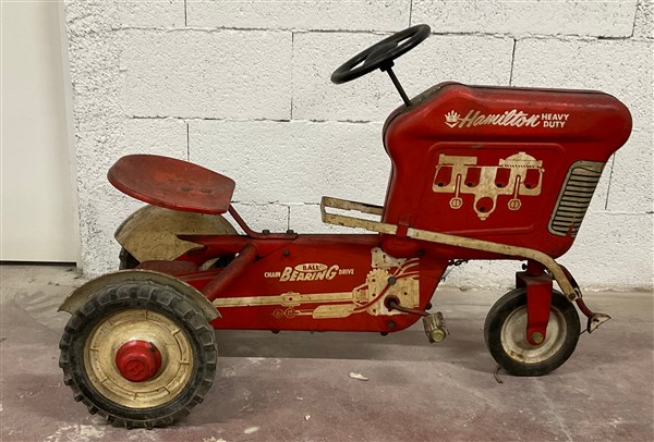 Lotto di due tricicli vintage in metallo smaltato a forma di trattore e di aero