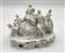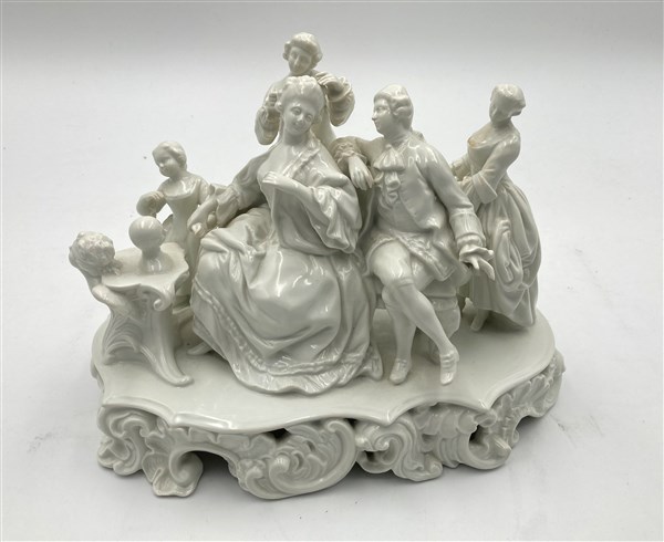 Gruppo in porcellana raffigurante scena di vita di corte, su base a volute fogl