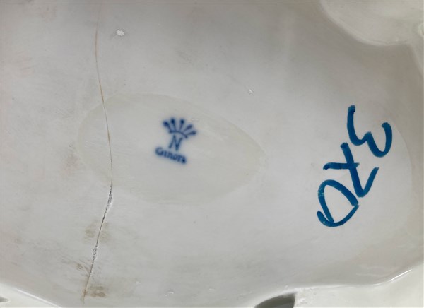 Gruppo in porcellana raffigurante scena di vita di corte, su base a volute fogliate (cm 34x22x16) (restauri)