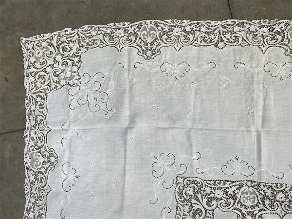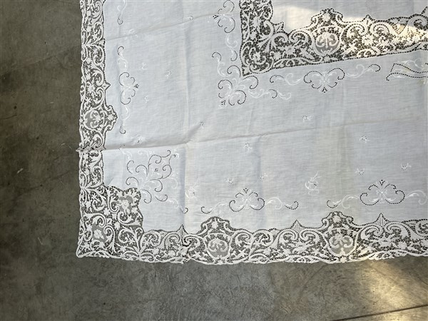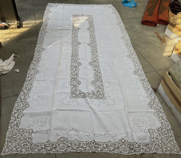 Tovaglia in tessuto di lino con applicazioni in pizzo al tombolo (cm 394x170) (