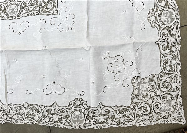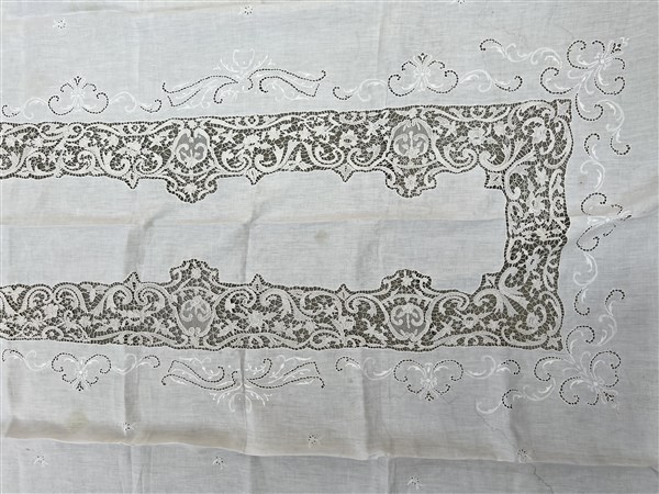 Tovaglia in tessuto di lino con applicazioni in pizzo al tombolo (cm 394x170) (difetti)