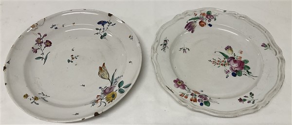 Lotto di due antichi piatti in terraglia con decori floreali policromi a piccolo fuoco (d cm 23) (difetti e restauri)