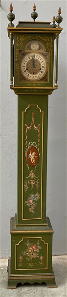 TEMPUS FUGIT. Pendola a torre in legno laccato e decorato in policromia. Movimento a tre treni con suoneria Westminster (cm 34x188x23) (difetti)
