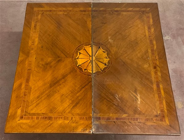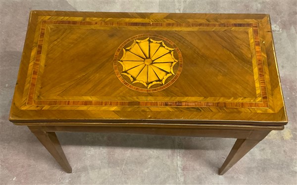 Tavolino da gioco lastronato, intarsiato e filettato in bois de rose con piani centrati da medaglione con fiore. Gambe rastremate (piano chiuso cm 75x73x37) (difetti)