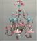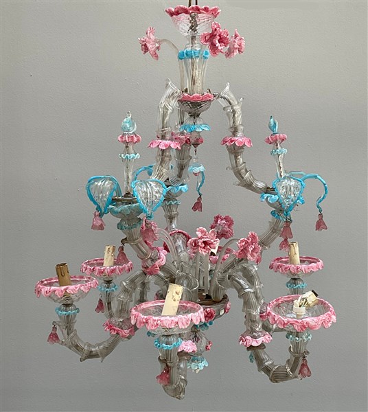 Lampadario a sei luci in vetro trasparente incolore con decori in pasta vitrea rosa e azzurro (d cm 65, h cm 80 circa). Secolo XX. (h cm 80; d cm 65) (difetti e mancanze)