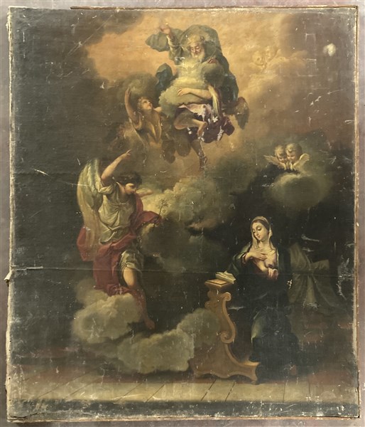 Ignoto, antico dipinto raffigurante "L'Annunciazione con Dio padre", olio su tela (cm 130x113,5)