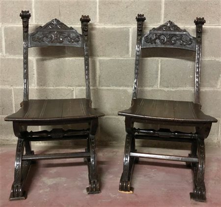 Coppia di sedie in legno con schienale a giorno, intagliate a volute e figure, gambe a ''x'' riunite da traverse (difetti)