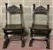 Coppia di sedie in legno con schienale a giorno, intagliate a volute e figure,