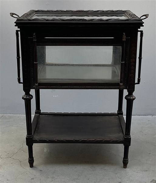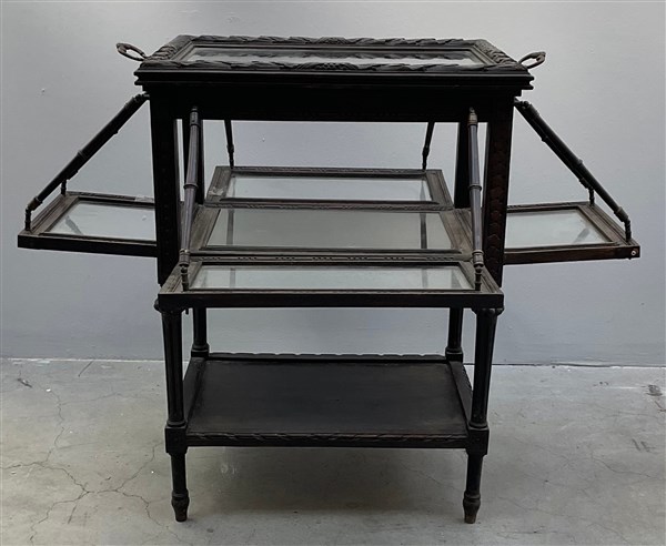 Mobile bar in legno intagliato con vano a vetrina e fianchi apribili, piano con vassoio asportabile.(chiuso cm 67x68x42) (difetti)
