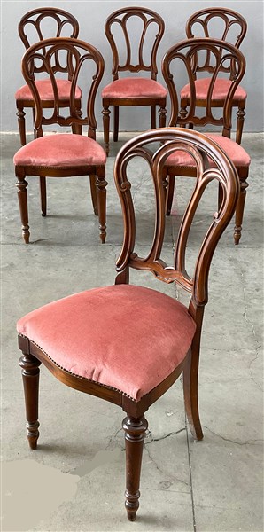 Gruppo di sei sedie con gambe anteriori tornite e schienali a giorno (difetti)