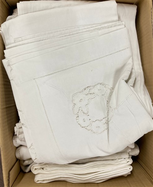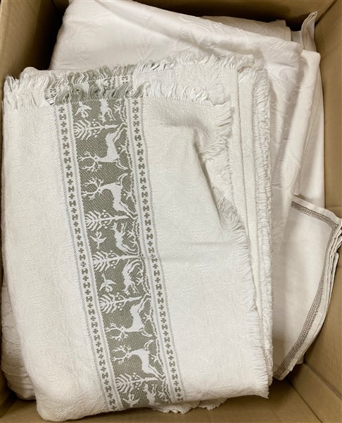 Tre cartoni contenenti numerose tovaglie e stoffe varie per la casa (difetti)