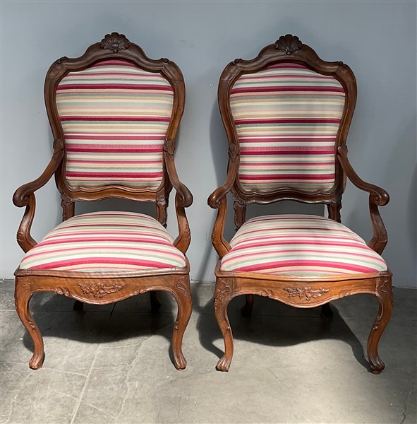 Coppia di antiche poltrone in legno intagliato di forma mossa. Schienale sagomato con cimasa a valva di conchiglia. Braccioli e gambe terminanti a ricciolo, copertura in tessuto rigato (difetti)