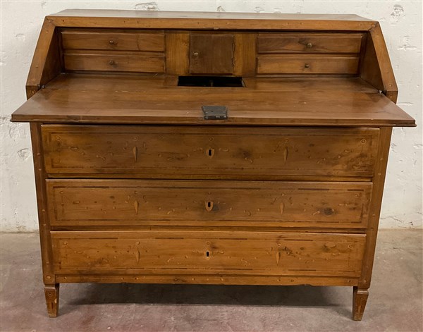 Ribalta in noce intarsiata e filettata a tre cassetti calatoia celante sportello, quattro cassettini e un segreto. Secolo XVIII (cm127x114x58) (difetti, restauri e mancanze)