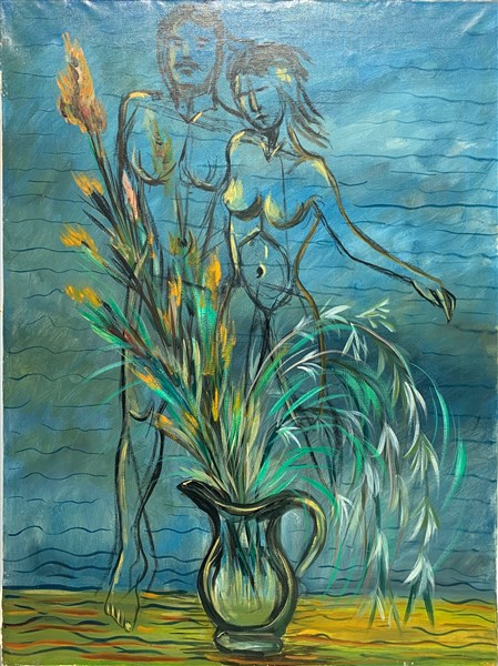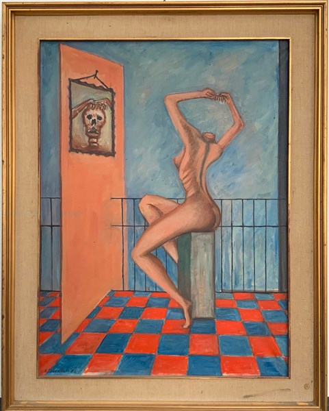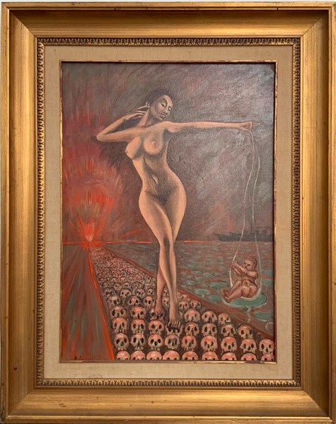 Lotto di quattro dipinti ad olio su tela raffiguranti temi d'ispirazione simbolista (cm max 80x60 circa)