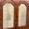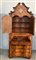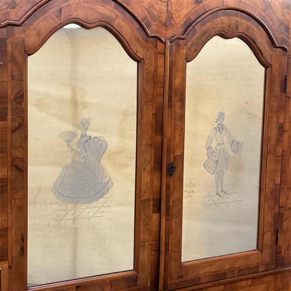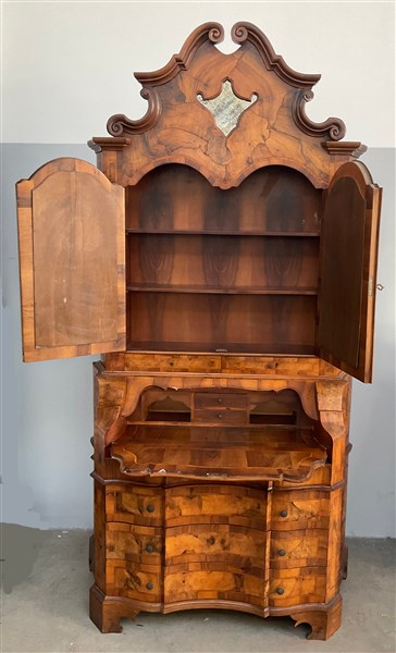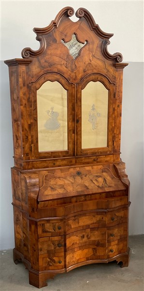Mobile a due corpi lastronato in noce e radica di noce, con parte inferiore a tre cassetti e ribalta celante cassettini e vani a giorno, parte superiore a due cassetti e due ante con specchi decorati con figure, cimasa mossa e piedi a mensola. (cm 120x249x52) (difetti)