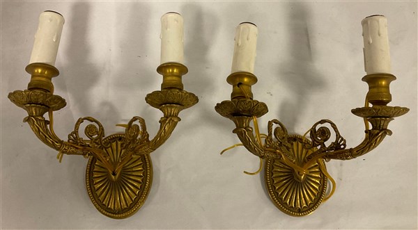 Coppia di applique a due fiamme in bronzo decorato e cesellato a volute e fiori