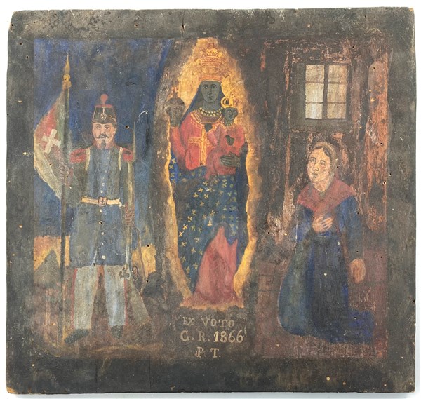 Ex-voto raffigurante Madonna stante con bambino tra due figure (cm 31,5x29x2) (difetti, mancanze)