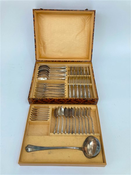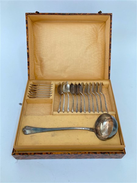 Servizio da sei persone in metallo argentato con custodia cartonata (difetti)