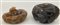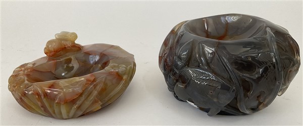 Lotto composto da due posaceneri in pietra dura decorati a fiori, coniglio e pesci
