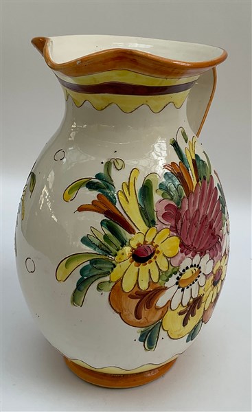 Portaombrelli a forma di versatoio in terracotta dipinto in policromia a motivi floreali (h cm 45) (difetti)