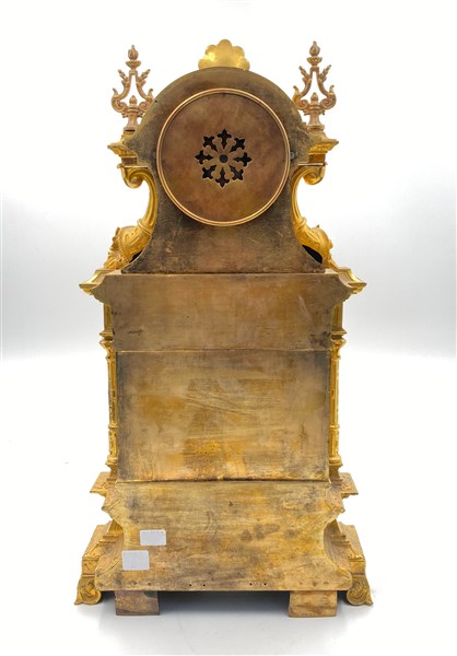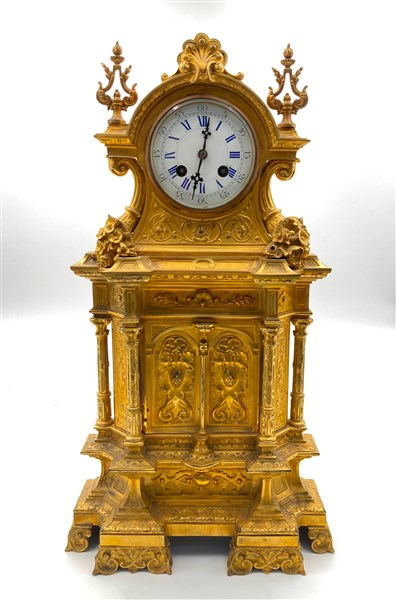 Pendola in bronzo dorato di forma architettonica riccamente decorata. Quadrante in smalto bianco a numeri romani per le ore, arabi per i minuti. Movimento settimanale con suoneria delle ore e mezze su campanello. Scappamento a bilanciere. Francia, ultimo quarto del secolo XIX (h. cm 50) (difetti e sostituzioni)