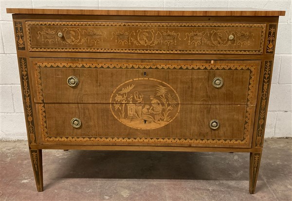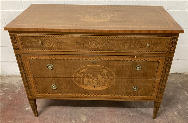 Antico comò a due cassetti e mezzo con fronte, fianchi e coperchio interamente intarsiati e filettati a vasi fioriti e figure, gambe rastremate (cm 120x92x54) (difetti)