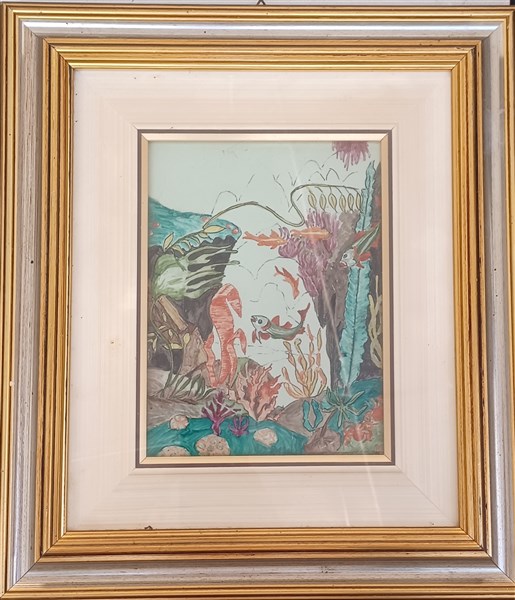 Lotto composto da una piastrella dipinta a fondale marino, tre placche dipinte