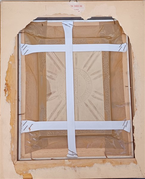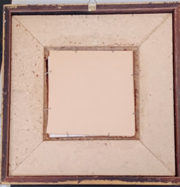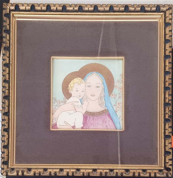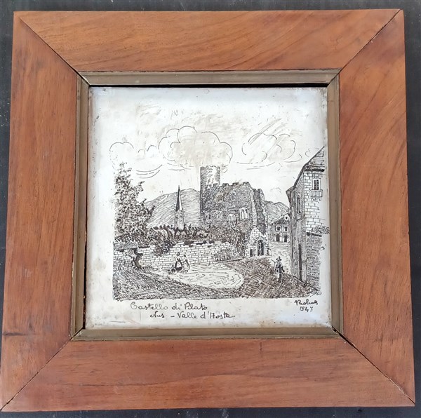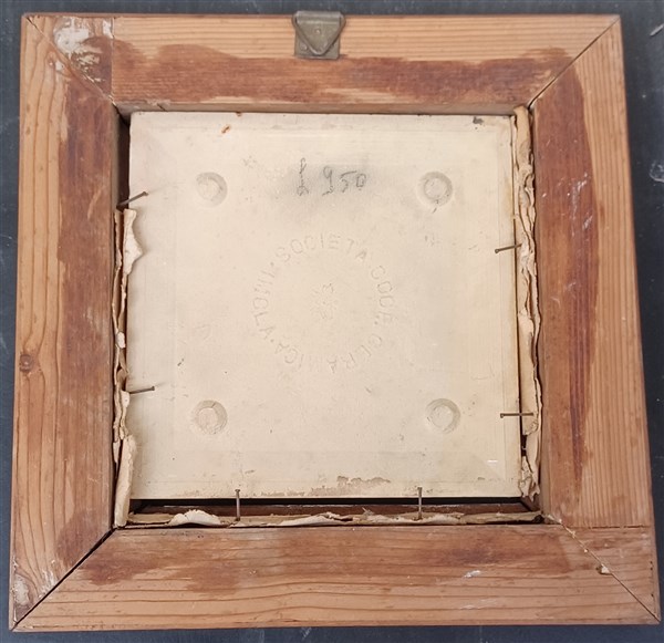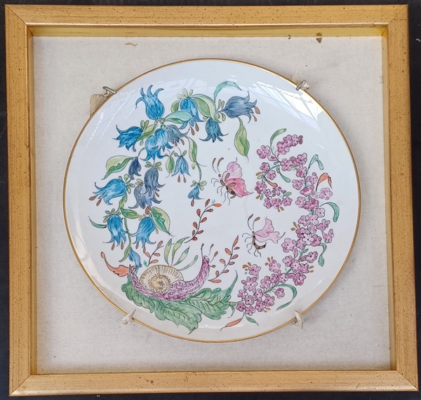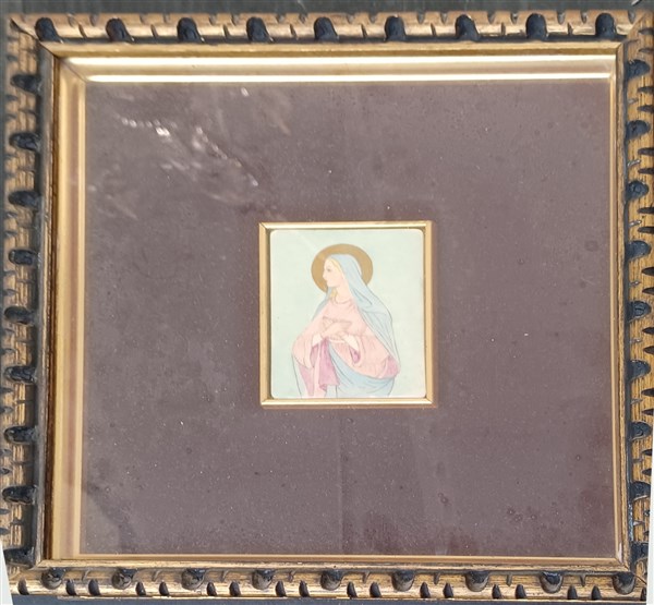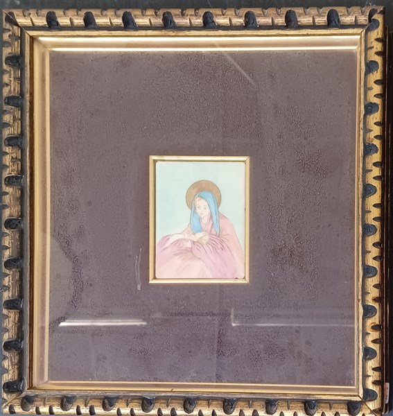 Lotto composto da una piastrella dipinta a fondale marino, tre placche dipinte raffiguranti Maria e il Bambino, una piastrella raffigurante il castello di Plato ed un piatto in porcellana dipinto a soggetti naturalistici, misure differenti, in cornici (difetti)