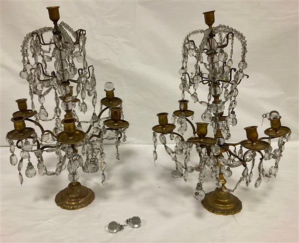 Coppia di candelieri a sette fiamme in metallo dorato e decorato a perlinature e pendagli in vetro e cristallo. Secolo XIX (h. cm 56) (difetti)