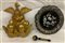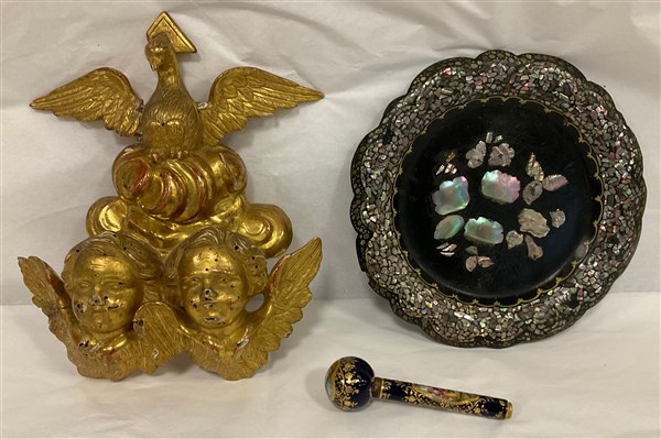 Lotto composto da un vassoio in lacca intarsiato in madreperla, manico d'ombrello in porcellana decorato con dorature in policromia e un fregio in legno intagliato e dorato del secolo XIX (difetti e mancanze)