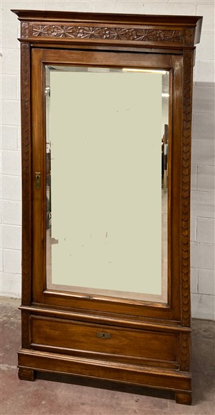 Armadio ad un anta a specchio con cassetto alla base, montanti a cappello intagliati a motivi floreali e geometrici (cm 106x224x52) (difetti)