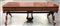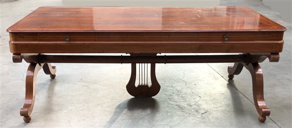 Tavolo scrivania lastronato in noce a due cassetti sottopiano, gambe mosse riunite da traversa con inserto centrale a lira (cm 196x76x90) (difetti)