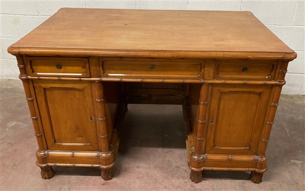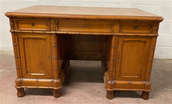Scrivania da centro a tre cassetti in linea e due ante nei montanti, colonne tornite finto bambù, piedi intagliati a motivi vegetali. Sec XIX (cm 130x80x76) (difetti)