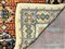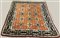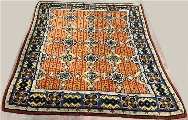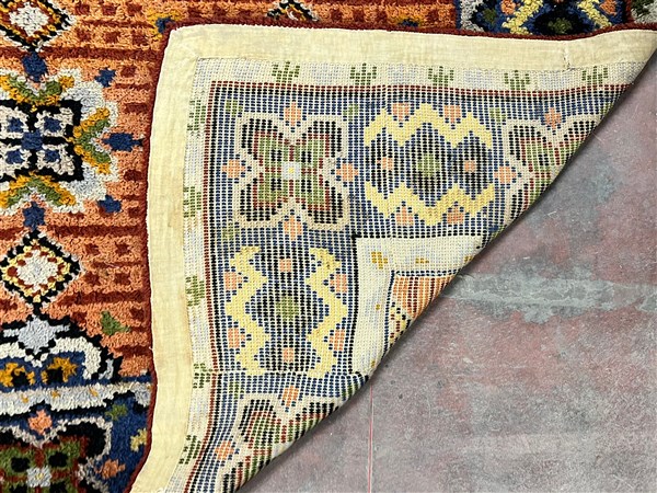Tappeto europeo, inizio secolo XX. Confezionato all'uncinetto su canovaccio in cotone a più teli. Decoro all over con motivi orientali nei toni del blu, beige, nero e giallo su campo color mattone. Bordura a fondo blu (cm 335x242) (difetti)