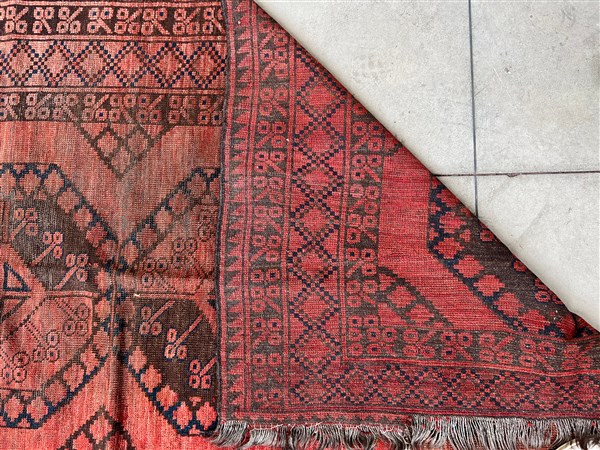Tappeto Afghan, Turkestan occidentale, secolo XX. Decoro a "piede d'elefante" con tre file di Gul di grandi dimensioni recanti all'interno il simbolo di Tamerlano, il trifoglio, campo color rosso mattone (cm 332x253) (difetti, rapature e mancanze)
