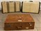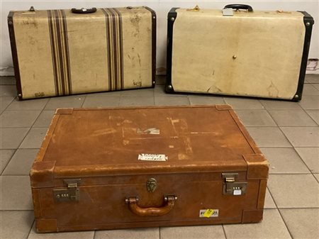 Lotto composto da tre valigie di cui una in pergamena (cod. lucchetto 069-069), una in cuoio e la terza in tela plastificata con profili in cuoio (cm max
