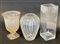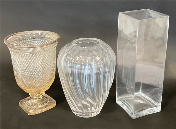 Gruppo di tre vasi portafiori in cristallo e vetro di diversa epoca e fattura (difetti)