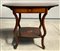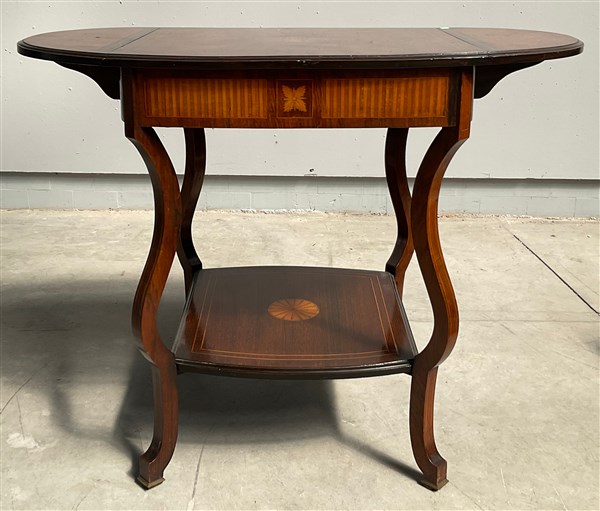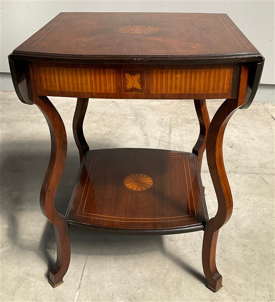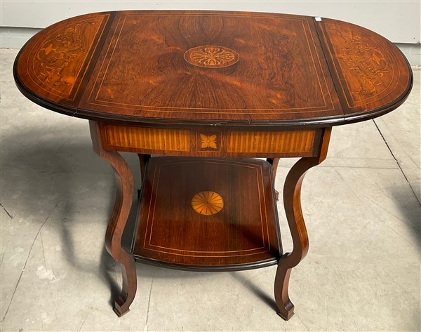 Tavolo ad alette filettato e intarsiato a volute e vasi fogliati. Cassetto sottopiano centrato da fiore entro motivi geometrici. Gambe di forma mossa riunite da pianetto (piano chiuso cm 56x70x54) (difetti)