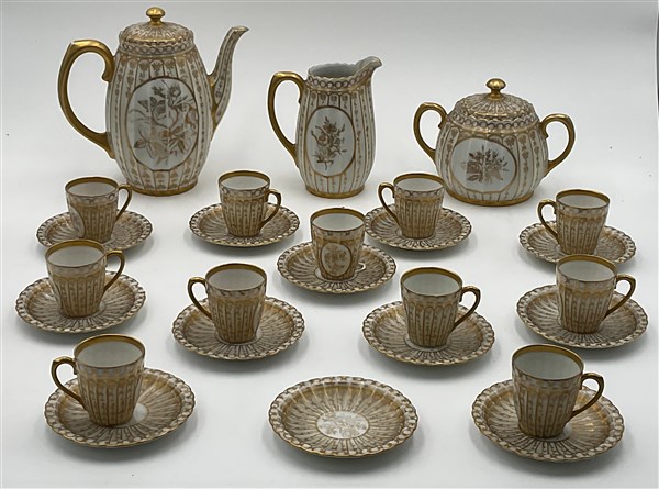 Manifattura tedesca. Servizio da caffè in porcellana decorata a fiori e doratur