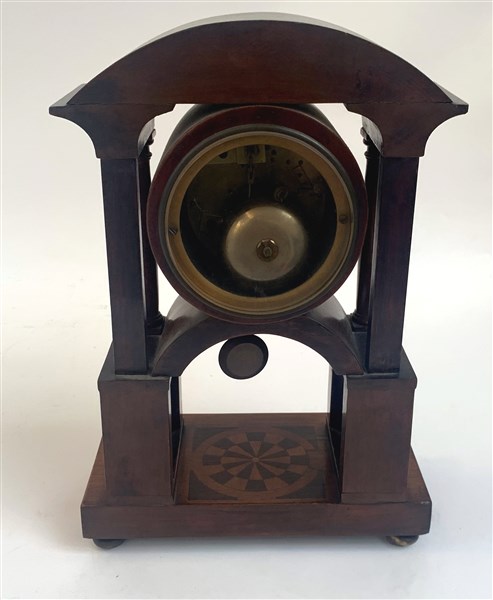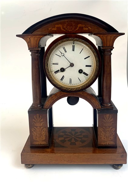 Pendola a portico di forma architettonica in legno intarsiato. Quadrante in smalto bianco a cifre romane, movimento a due treni con suoneria delle ore e mezze. Ultimo quarto secolo XIX (cm 25x36x13) (difetti)