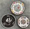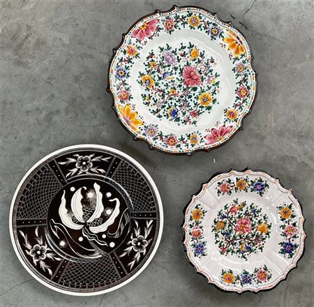 Lotto composto da due piatti in maiolica decorati a fiori policromi con bordo polilobato. Uniti a uno decorato sui toni del nero della manifattura Este (d. max cm 37,5)