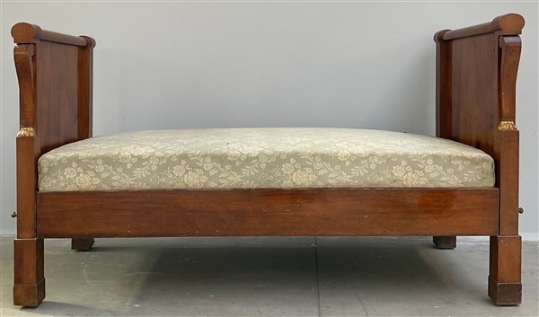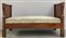 Divano a letto a muro lastronato, sponde con lesene anteriori a ricciolo e zampe ferine dorate, piedi a plinto. Secolo XIX (cm 168x101x75) (difetti)