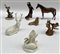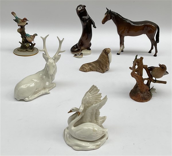 Manifatture differenti, lotto di sei sculture in porcellana policroma ed una in pietra dura raffiguranti animali, di cui uno marcato Besweick (h max cm 22)
