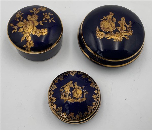 Manifattura di Limoges. Lotto di tre scatoline in porcellana blu con profili do